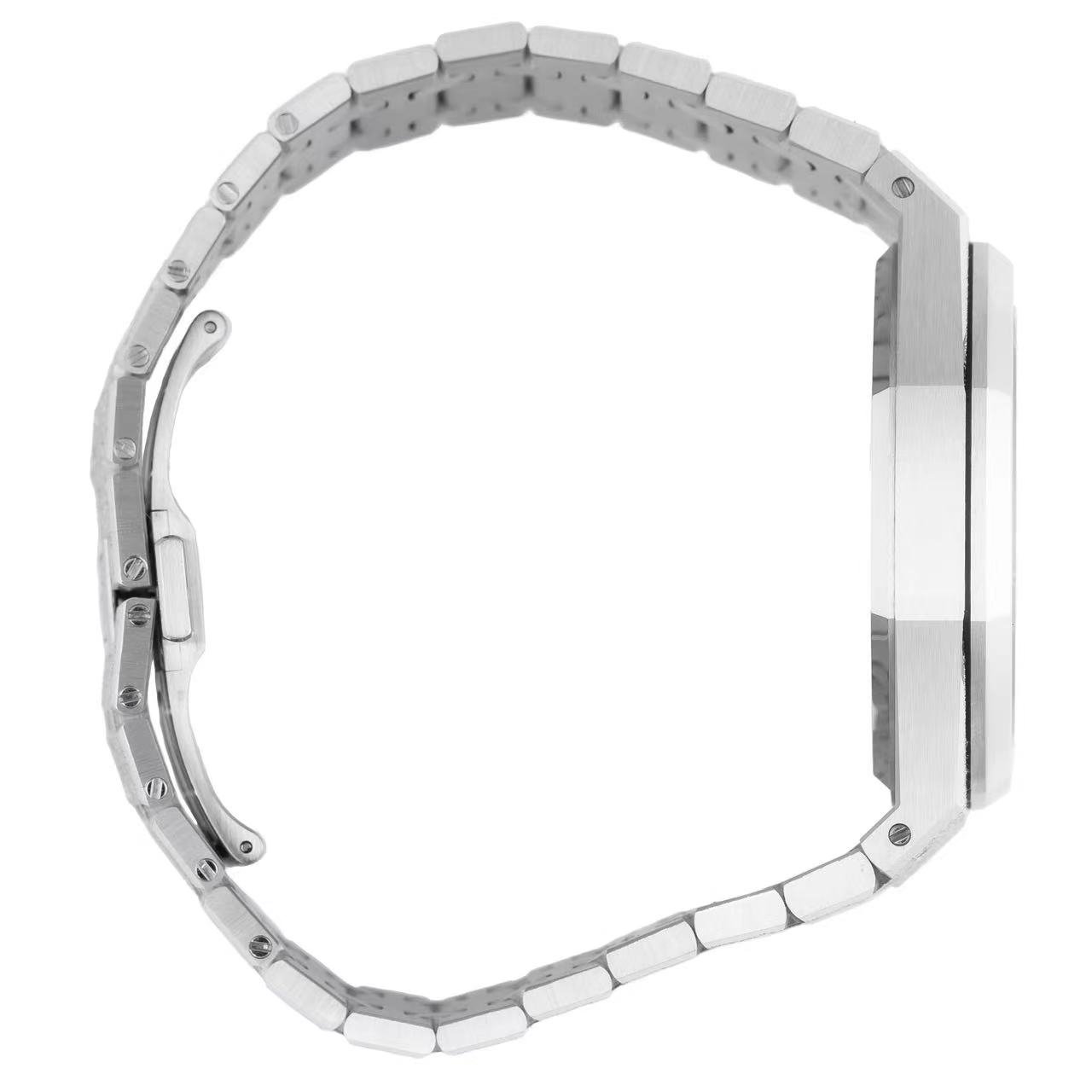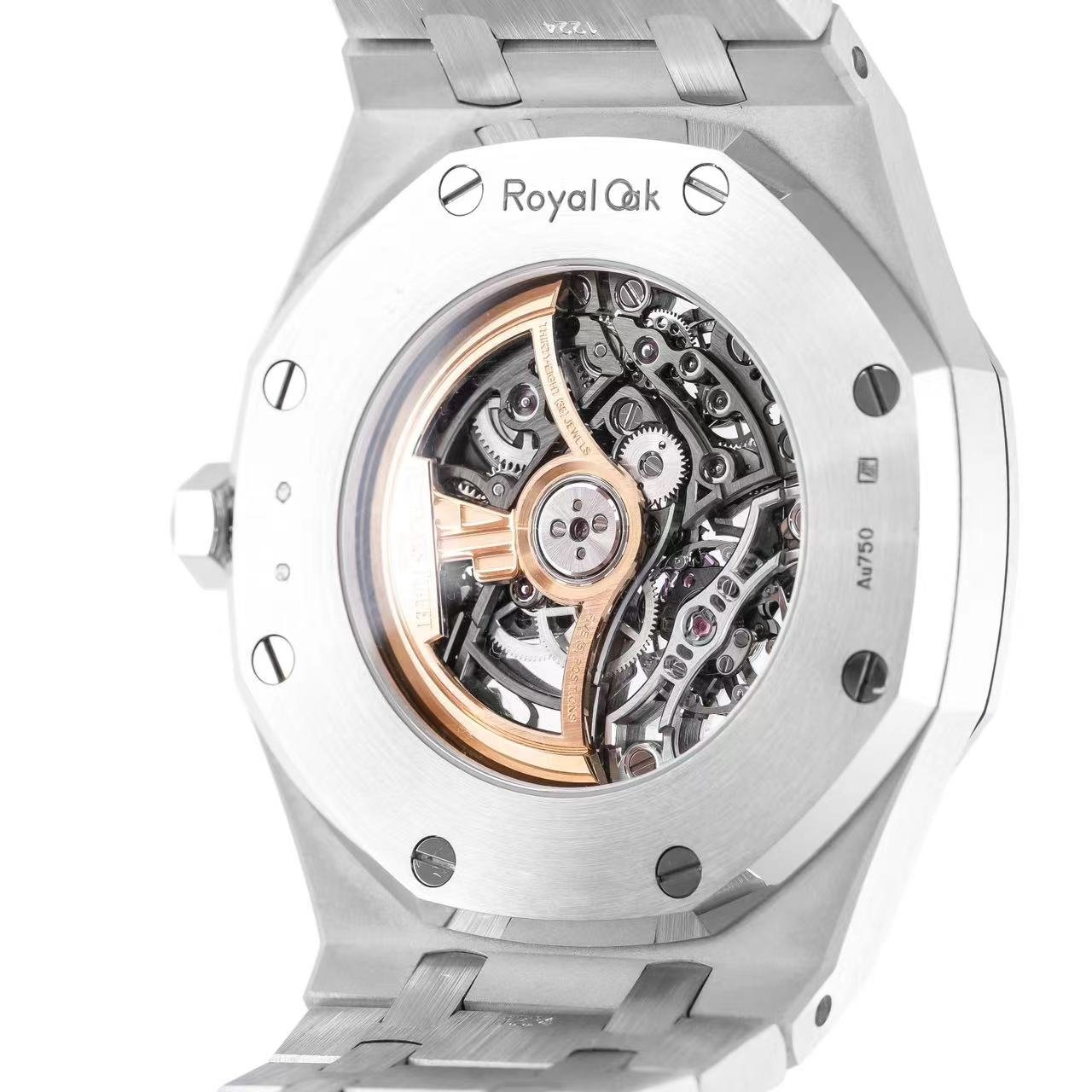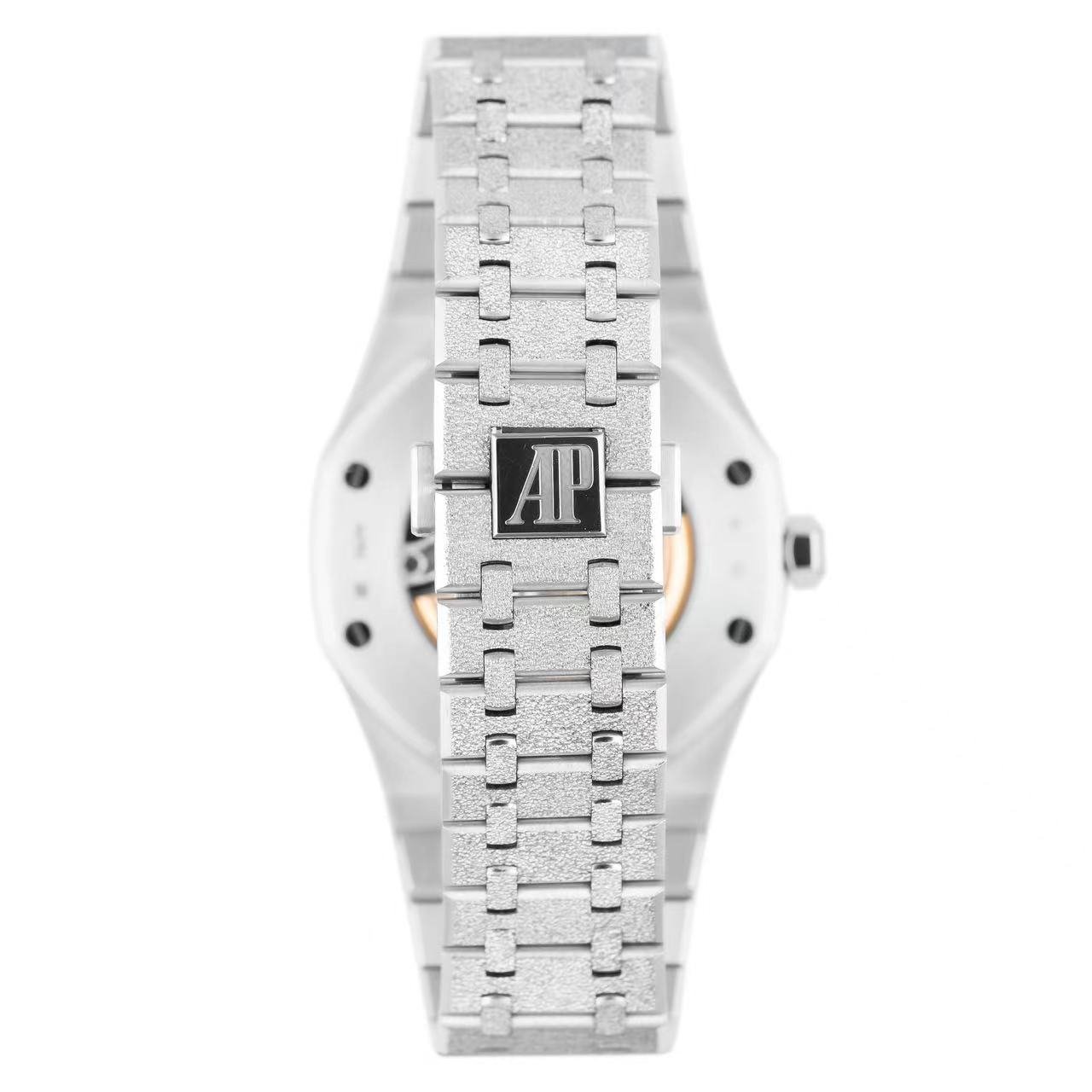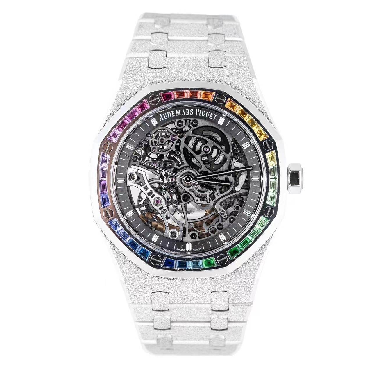 This 41 mm timepiece in shades of grey, ranging from the white Frosted gold case and bracelet to the slate grey openworked movement, is enriched with a rainbow bezel set with baguette-cut multicoloured gemstones.