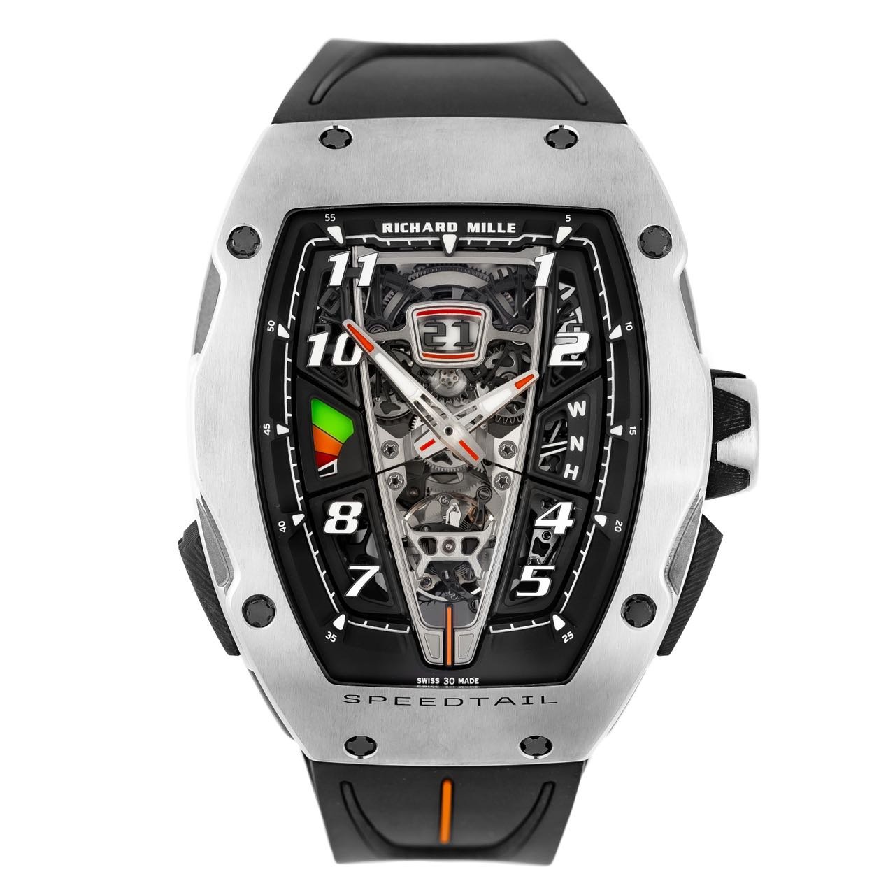 Richard Mille RM40-01 Speedtail,based on the form of a teardrop, the most aerodynamically efficient shape found in nature, the Speedtail is the apotheosis of the streamlined hypercar, a three-seat grand tourer that became the third car in McLaren’s Ultimate line-up. McLaren’s relentless pursuit of aerodynamic efficiency provided the starting point for the design of the RM 40-01 Automatic Tourbillon McLaren Speedtail. Limited 106 Pieces.